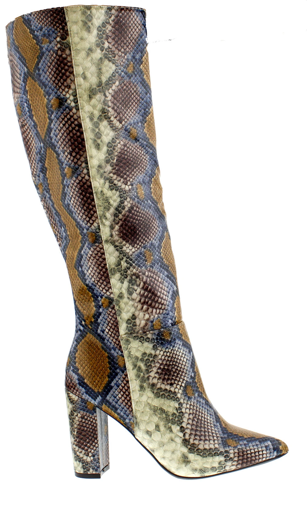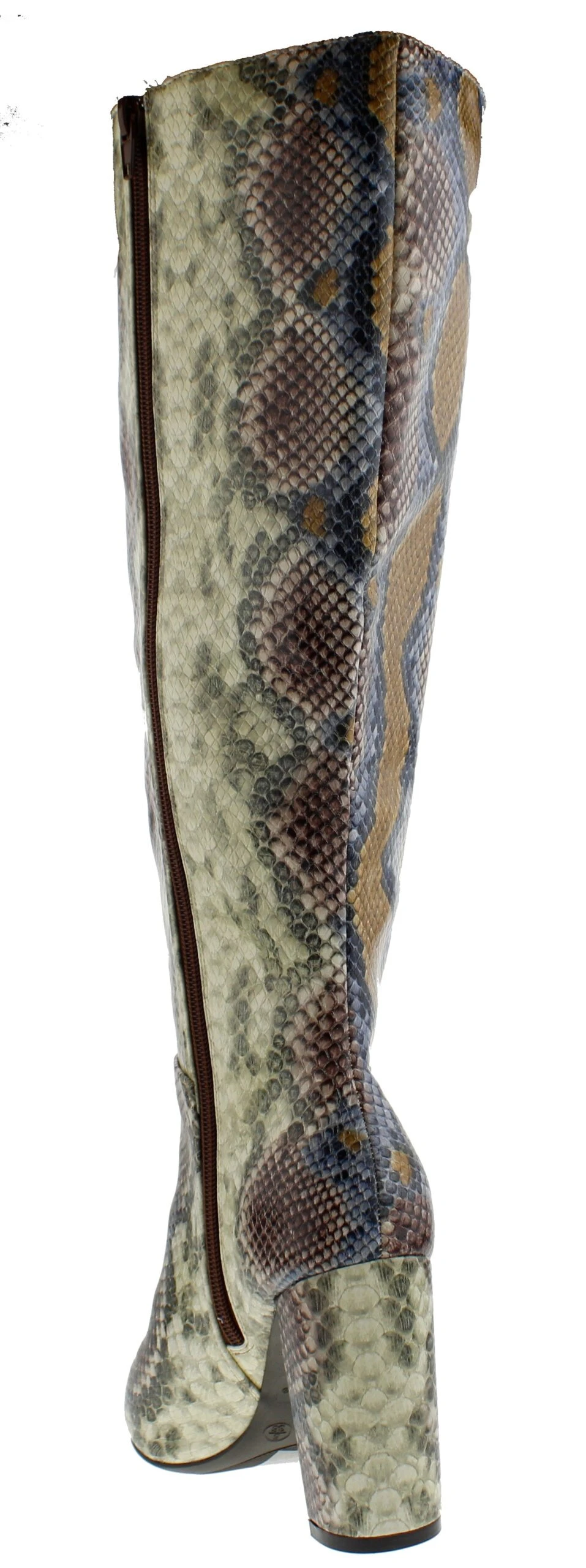 These stylish camel snakeskin knee high boots are perfect to tie your outfit together. They feature a chunky heel and a inside zipper with an almond toe