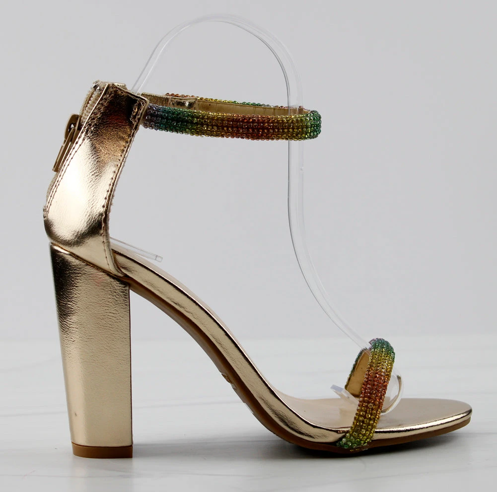 The Mania 81 Metallic gold heel is full of color. The straps feature a rope like design covered in multi colored rhinestones. A zippered back for easly slip on and cushioned for comfort.