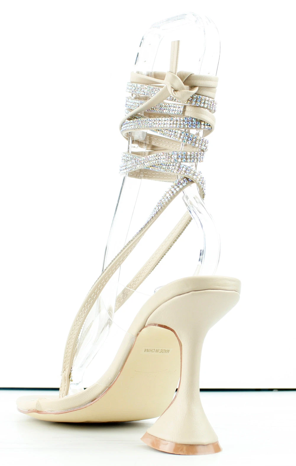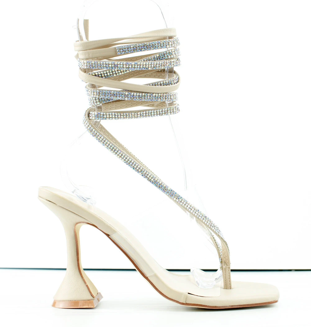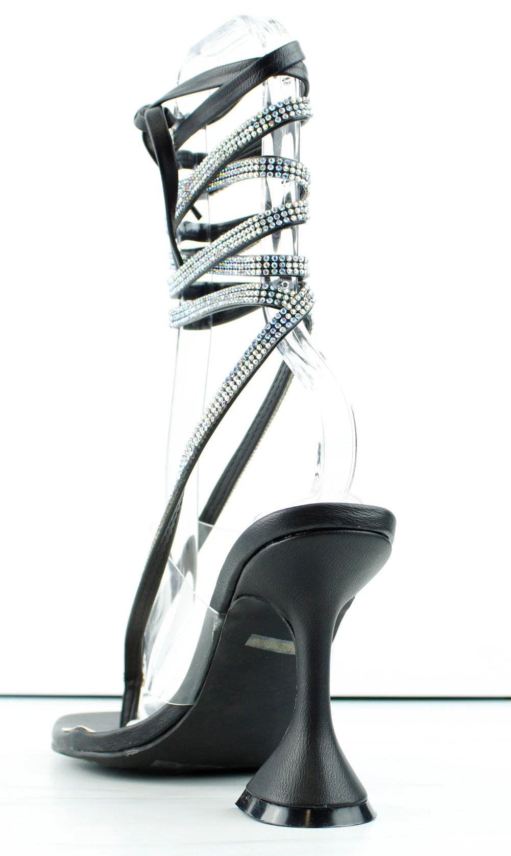 Featuring wraparound rhinestone straps, a thong rhinestone open toe and clear band. Let the shoes do the talking and pair with something simple.Â