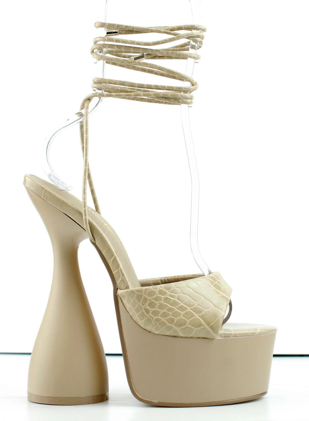 Step out in these unique but subtle pumps. Featuring an open toe with snake print band, a strappy lace up design and a stunning platform hourglass heel guaranteed to catch anyone’s attention. Heel Height Approx. 4.5 inches.Â