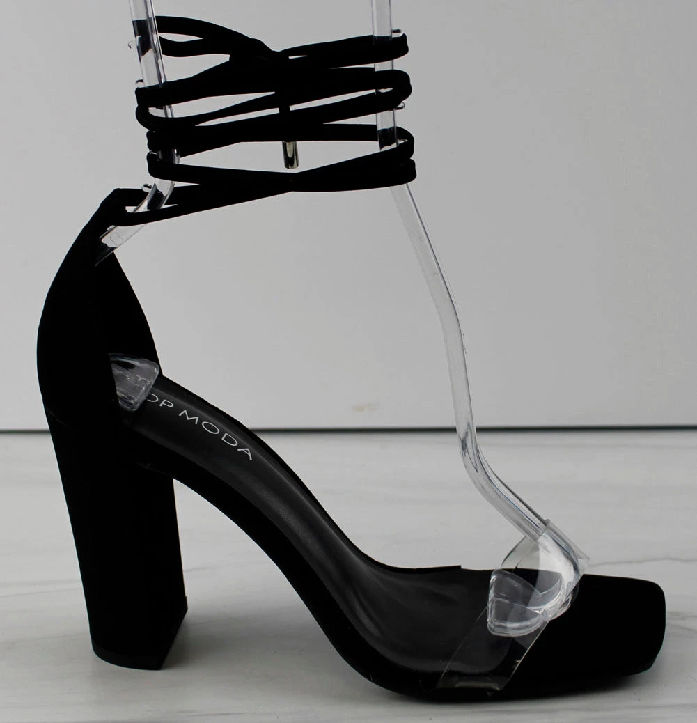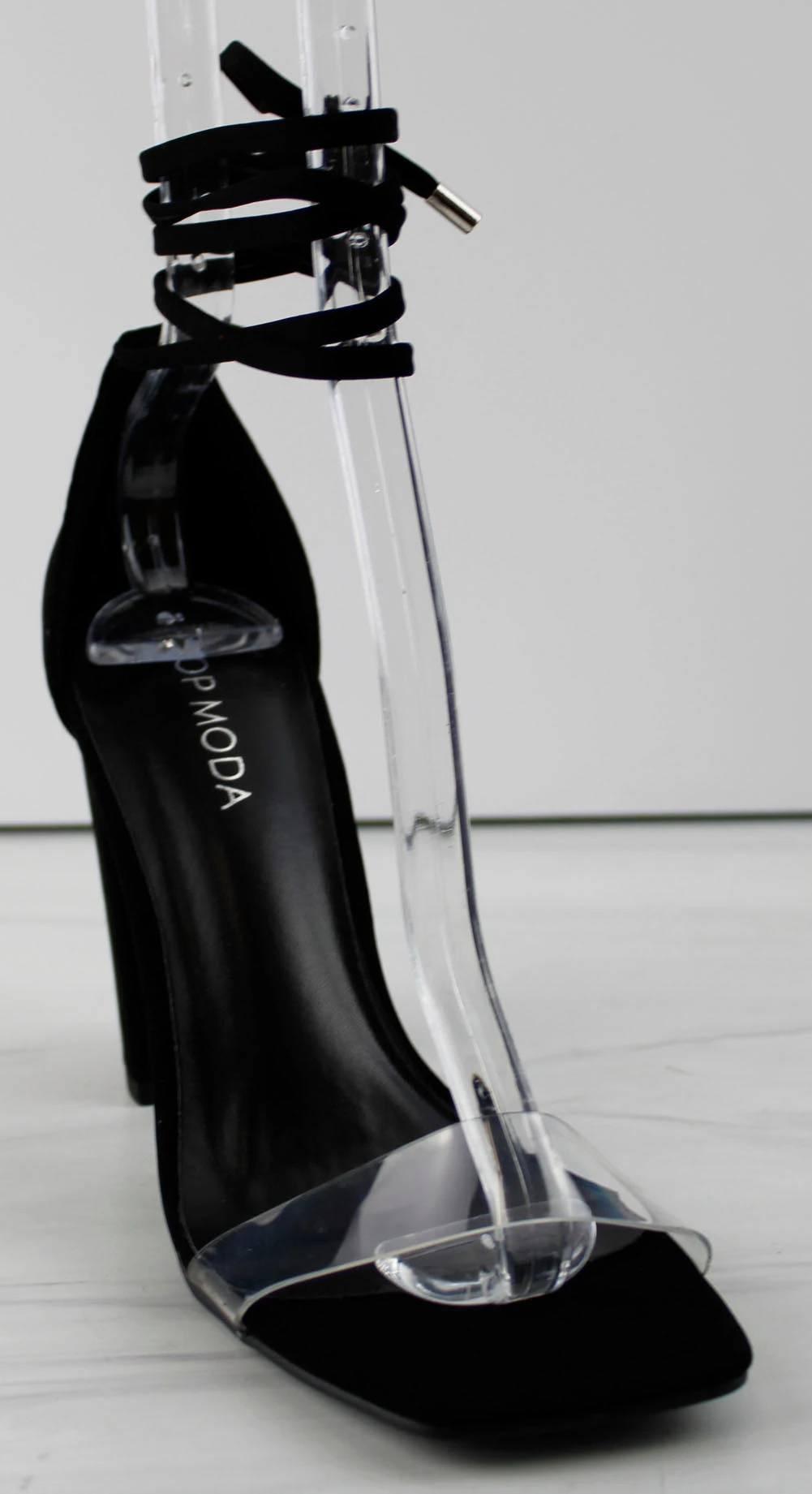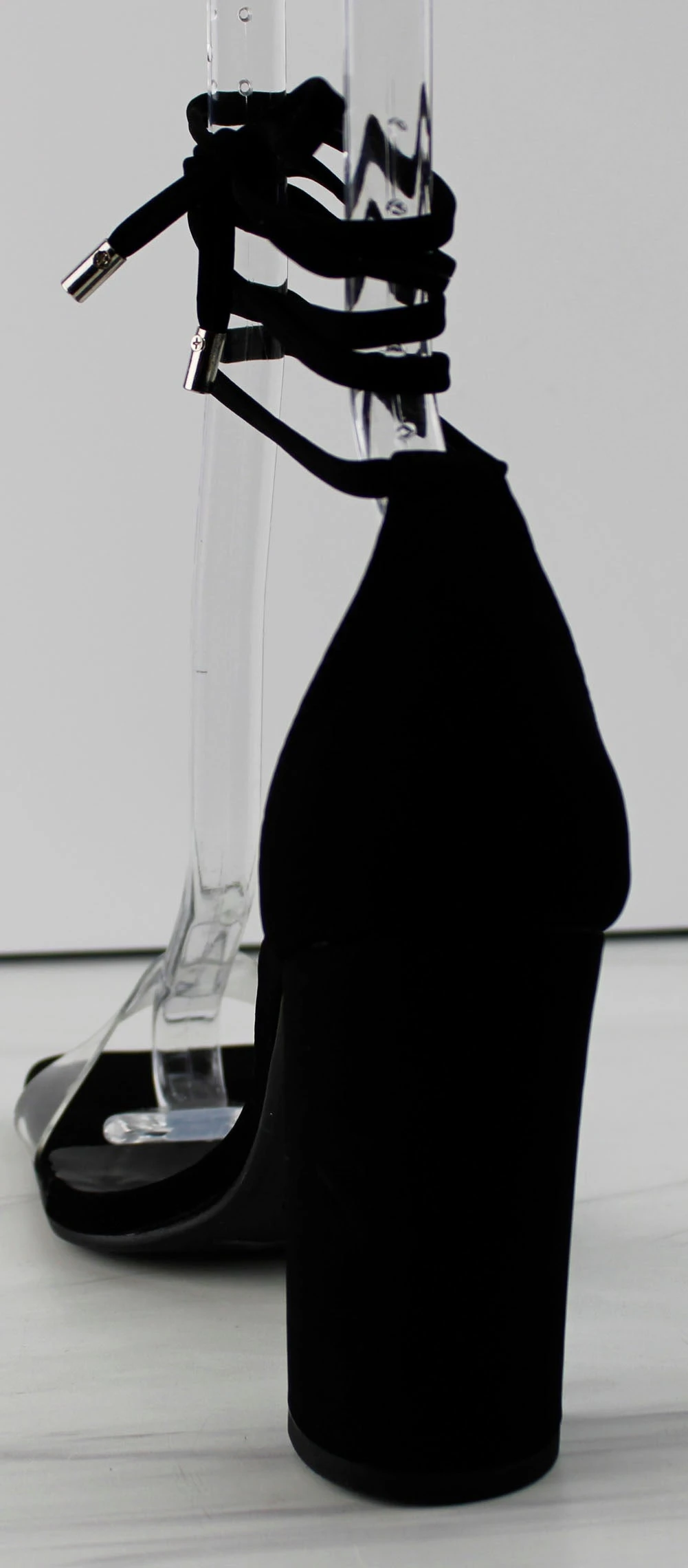 These classy lace up heels will add both style and comfort to any outfit. They feature a transparent over the toe strap as well as a chunky platform heel that makes them easy to walk on.Â