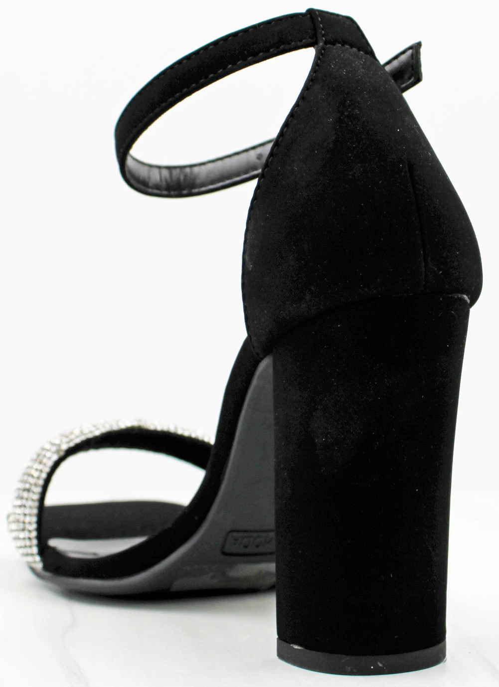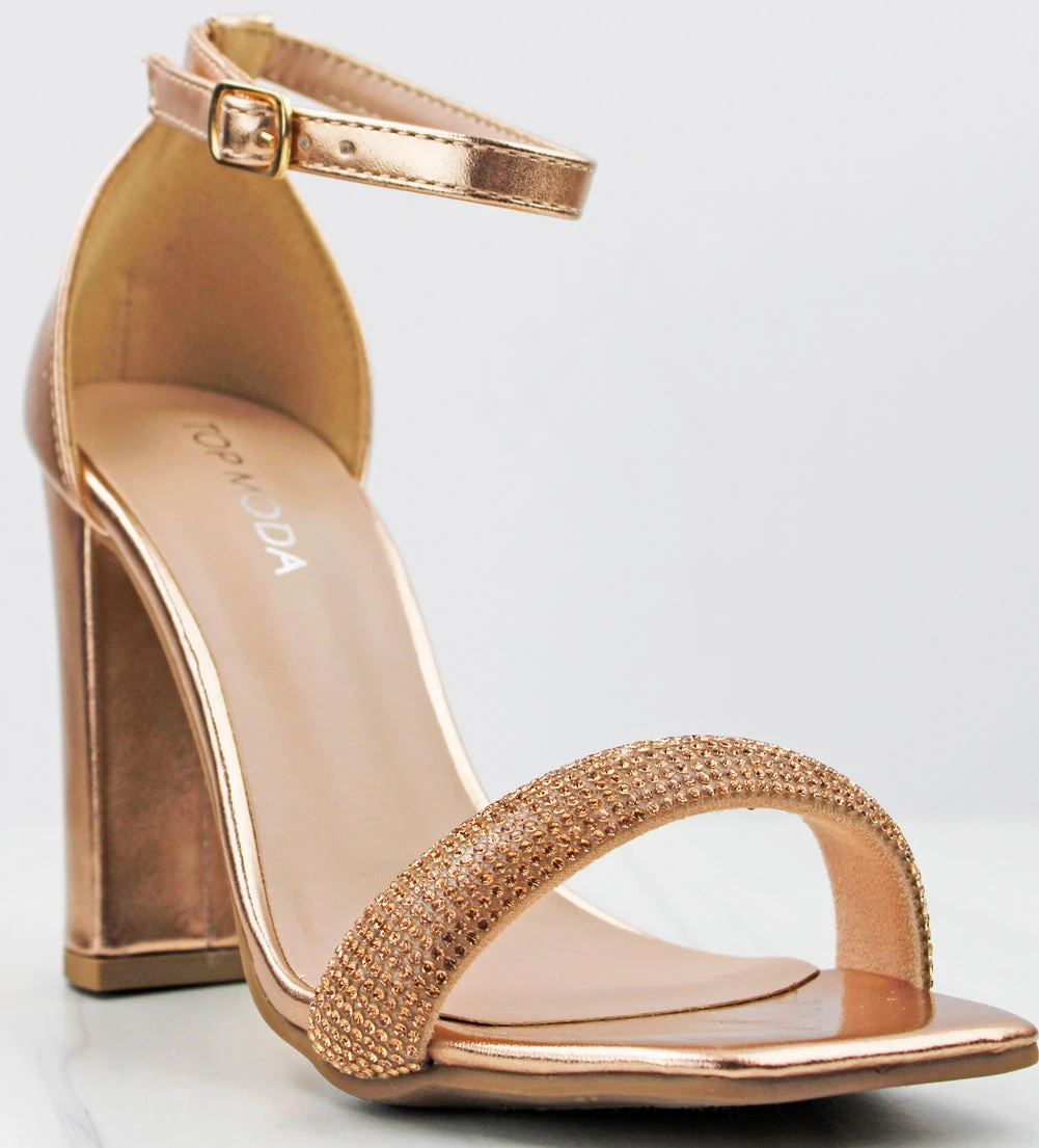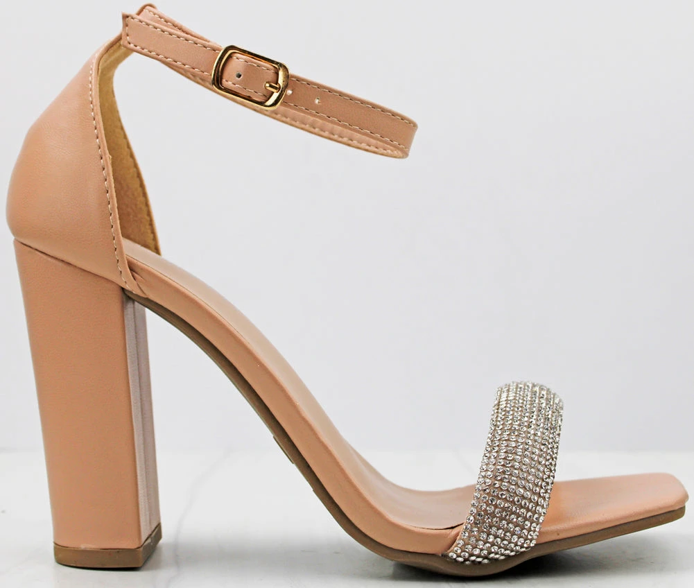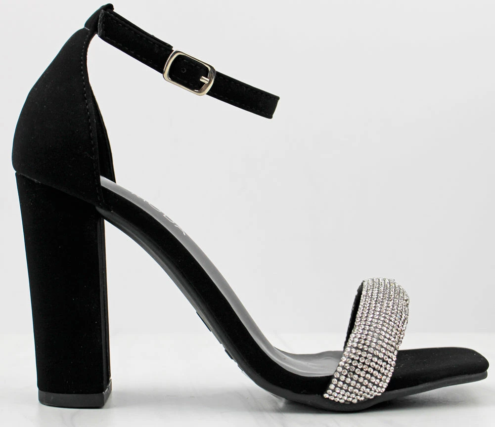 These open toe rhinestone heels are perfect for a night out! The chunky heel adds comfort which makes them easier to wear and walk in. The ankle buckle closure keeps you nice and secure!