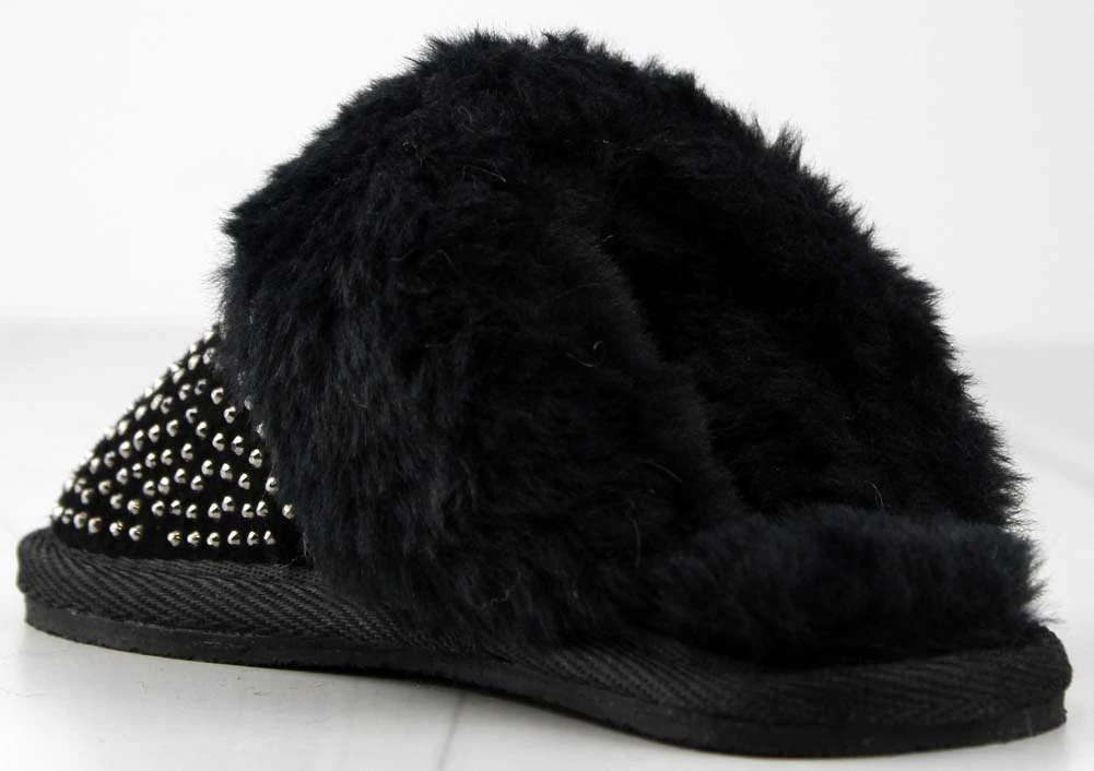 ‘Tis the season for hot chocolate and flashy slippers!!… Right? Who says we cant look fabulous, even around the house. All furred slipper offers warmth and comfort for those cold fall and winter nights. Added flat studs to dazzle up this simple slipper.Â