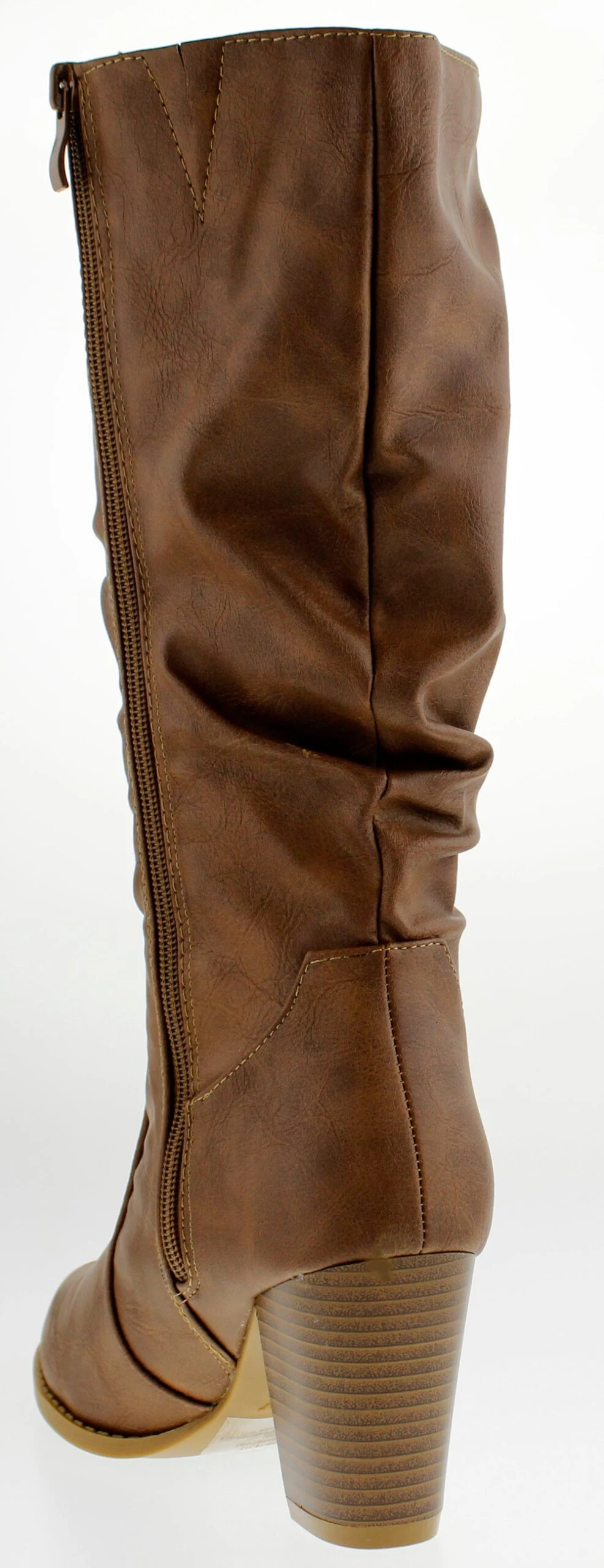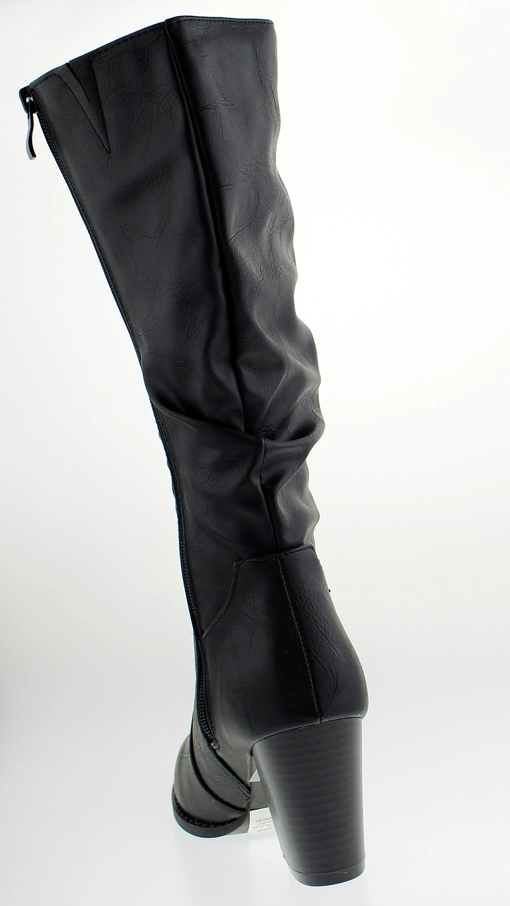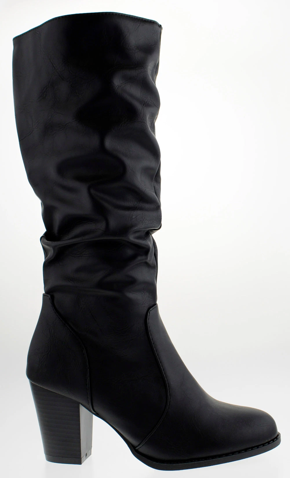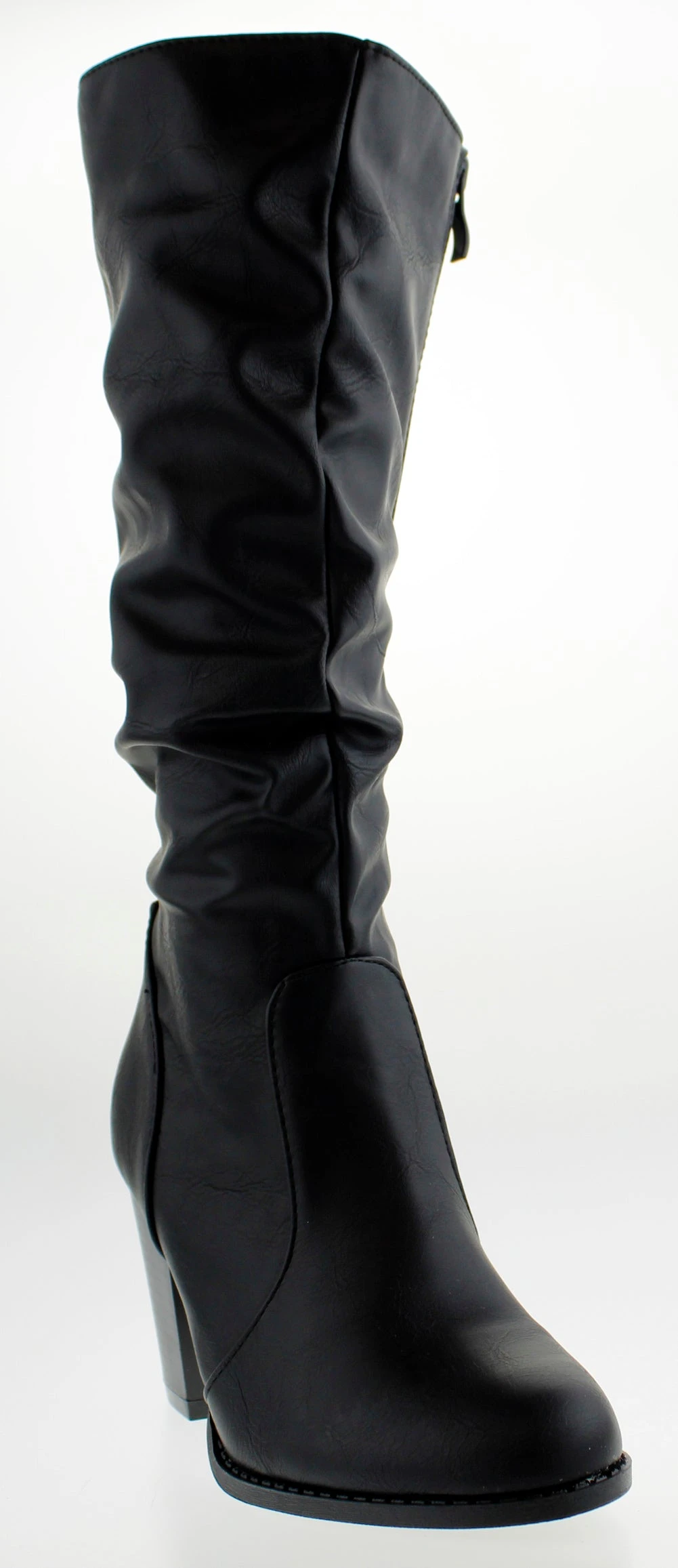 These knee high boots are a perfect match to a variety of outfits. The slouched faux leather pairs well with anything from a date night outfit to a casual jeans and a t-shirt look. They have a chunky heel for extra comfort and durability.