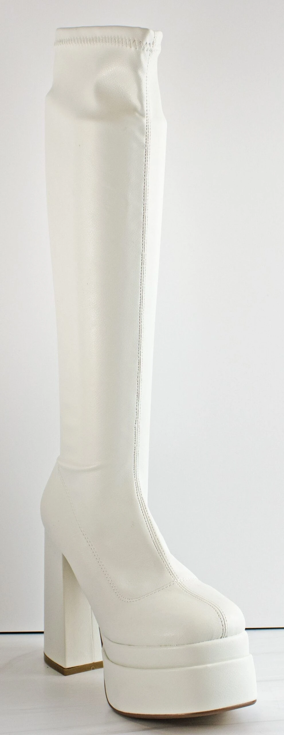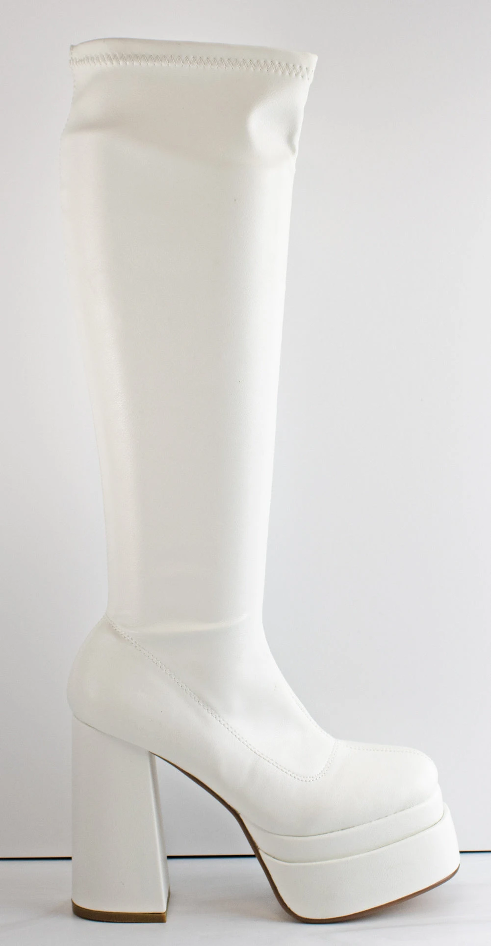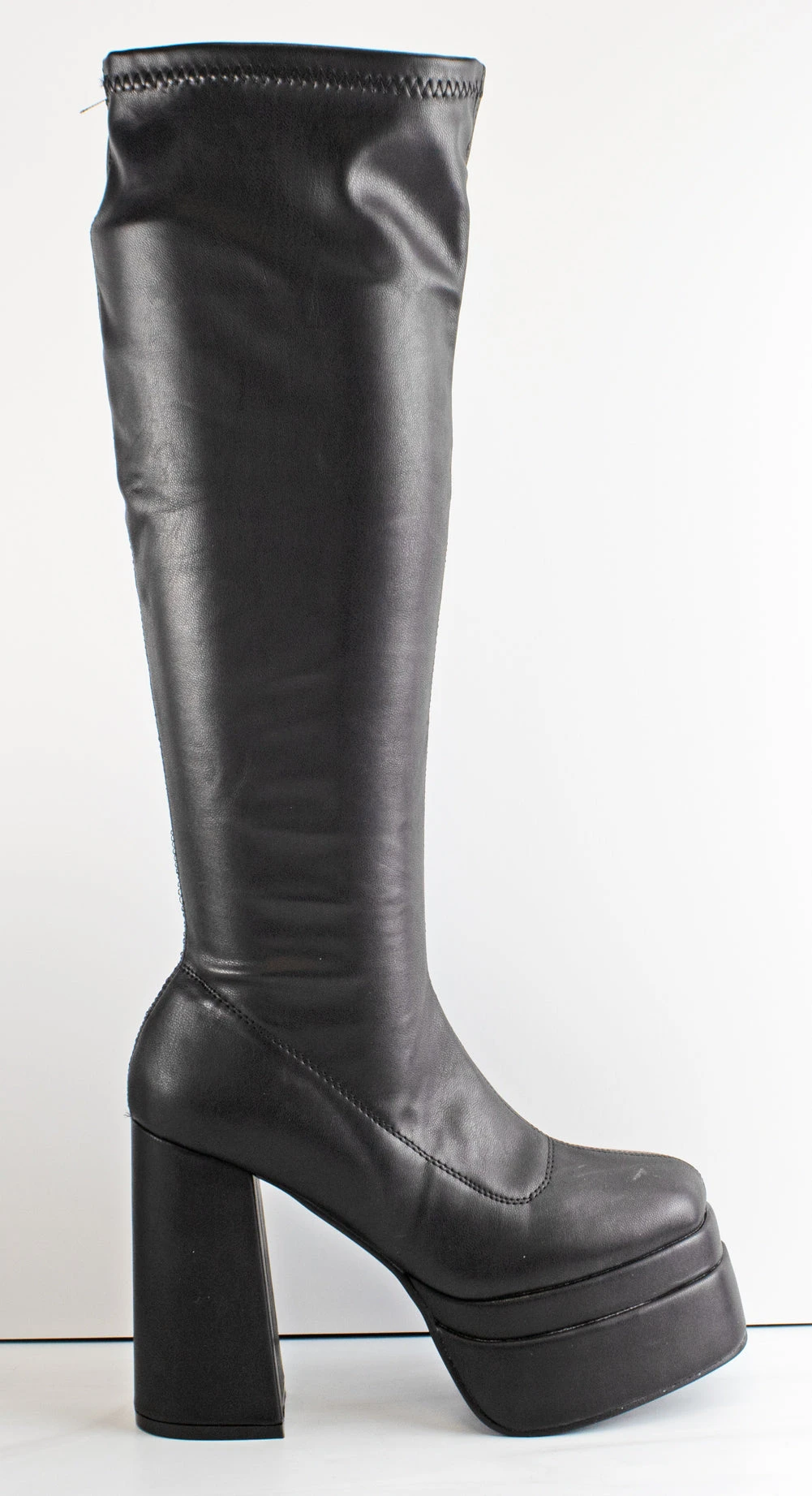 The Twice 18 knee high boot combines a stretch upper and an extra-high block heel for the ultimate leg-lengthening, calf-defining fit. The tiered front platform keeps your steps balanced and secure with a wide base.