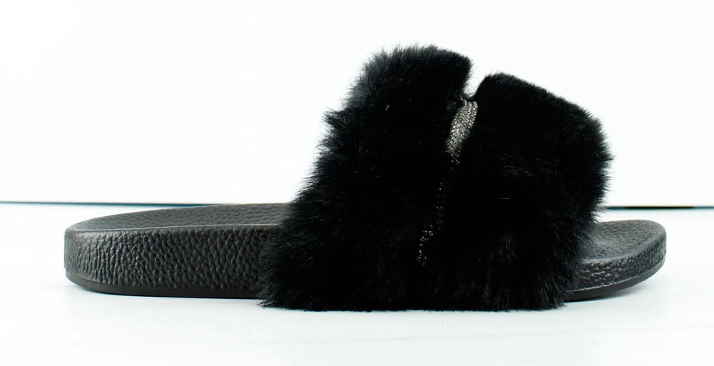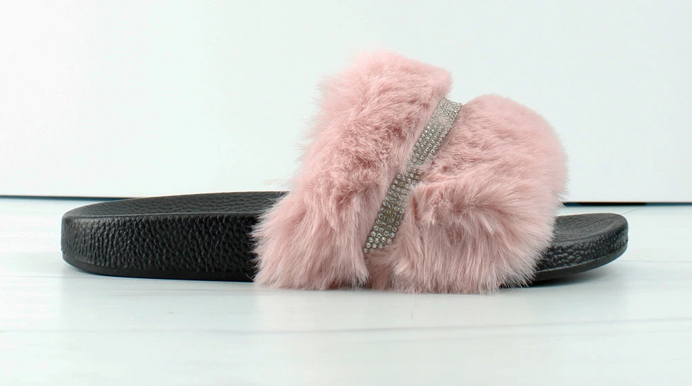 Slip on sandal with a rhinestone mid strap with faux fur. Great for comfort and style.