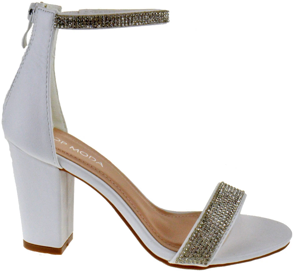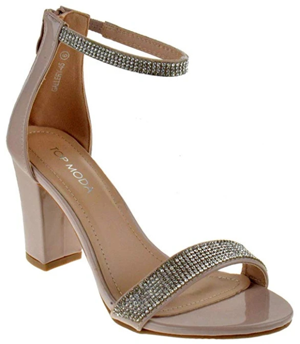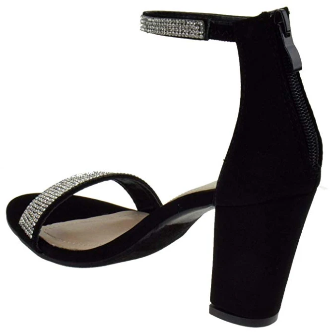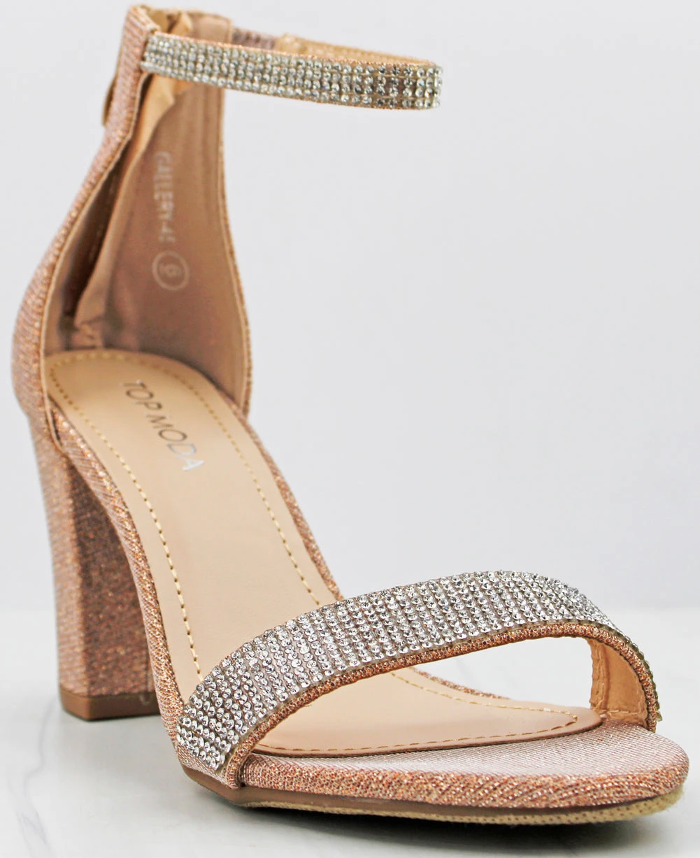 The Gallery is a super trendy heel right now! Simple rhinestone straps one across your toes and the other around your ankle. There is a zipper on the back. The thick block heel is 2.5″ inches tall. Easy and manageable to walk in!