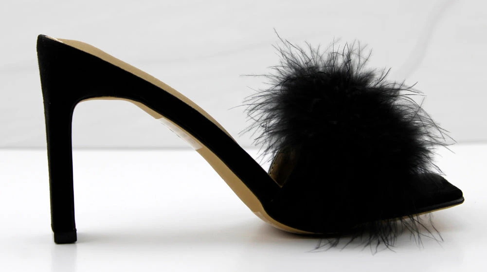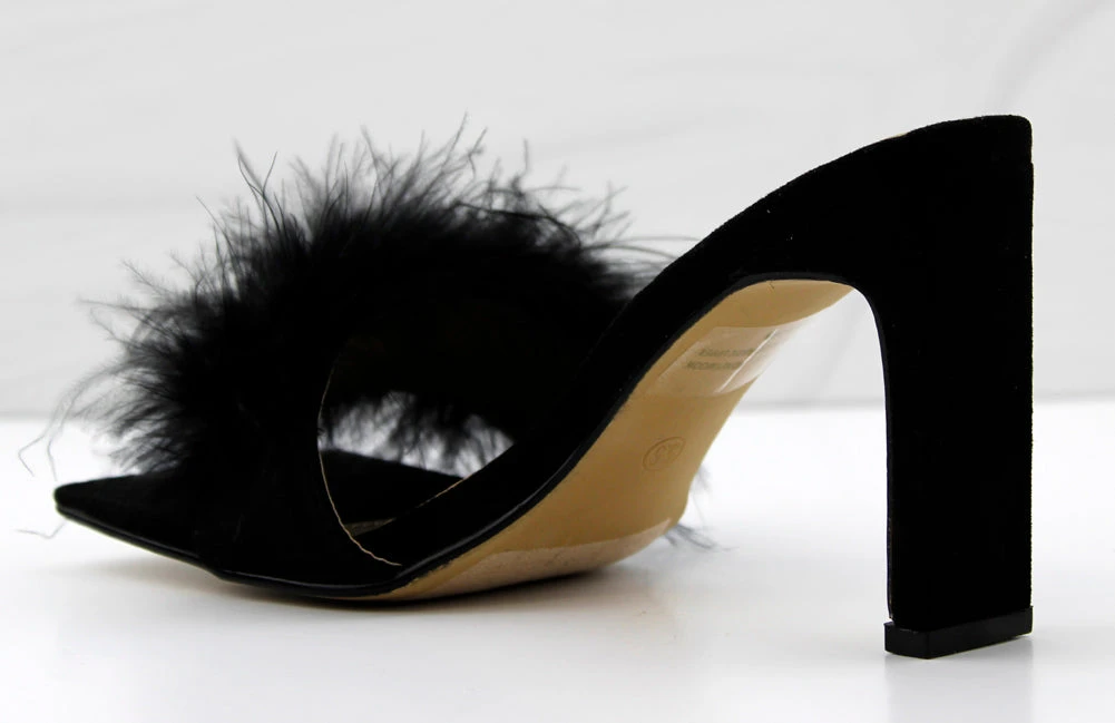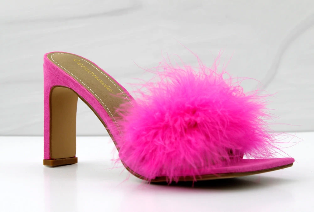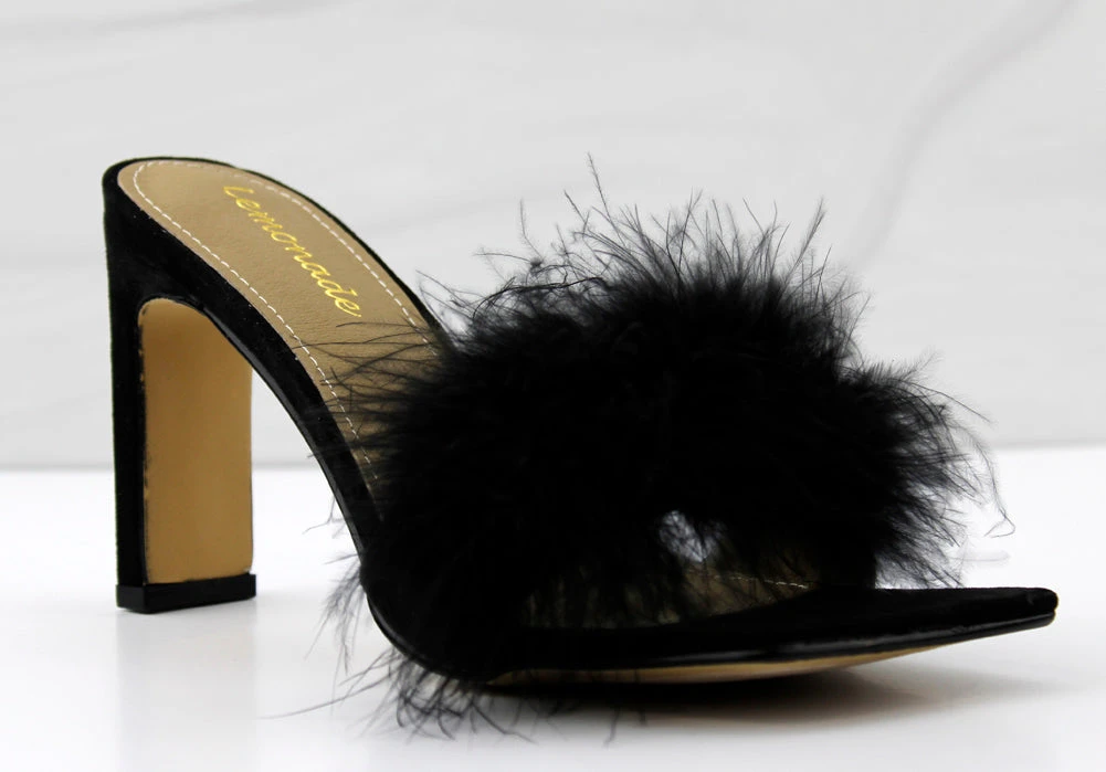 feel confident and fearless in Honeymoon. this sexy heel has faux fur a comfortable square toe soul and a sturdy flat rectangle heel. perfect for any night out..or in.