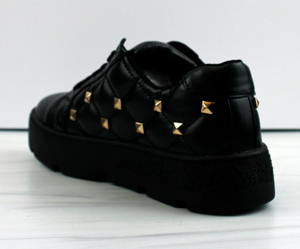 Fashionable lace up sneaker. Featuring a quilt like stitching and gold stud accents