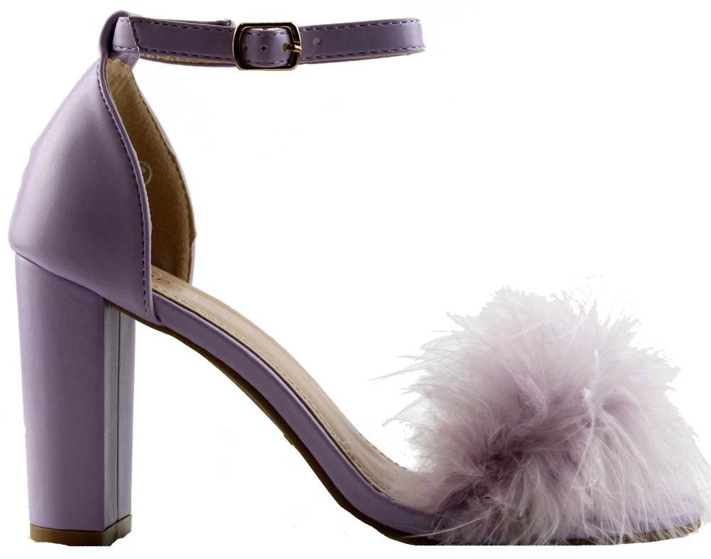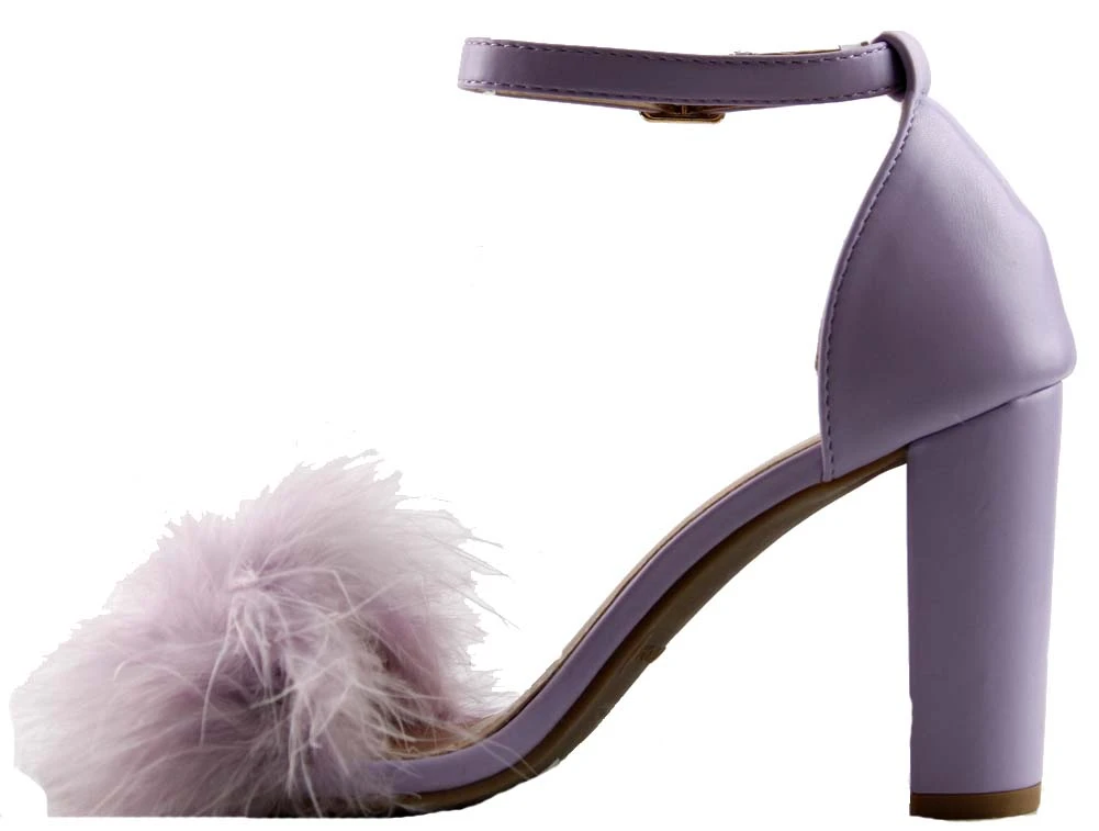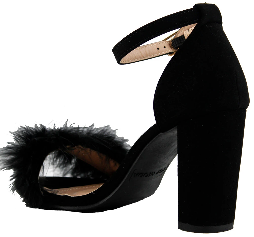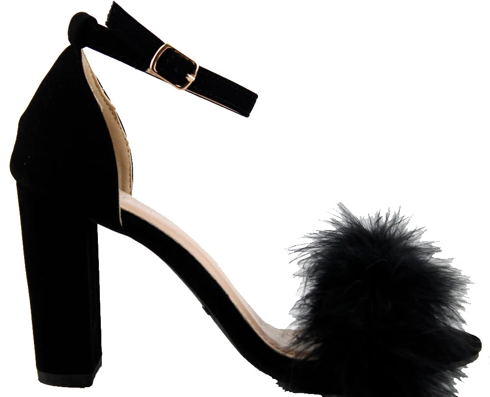 | Sleek and sexy, Ladies be sure to steal the spot light in any event with these feathered Fur block heeled sandals. The shoe featuers and approx 3.5 inch heel the shoe is light weight and has a buckle with ankle strap for secure fitting. |