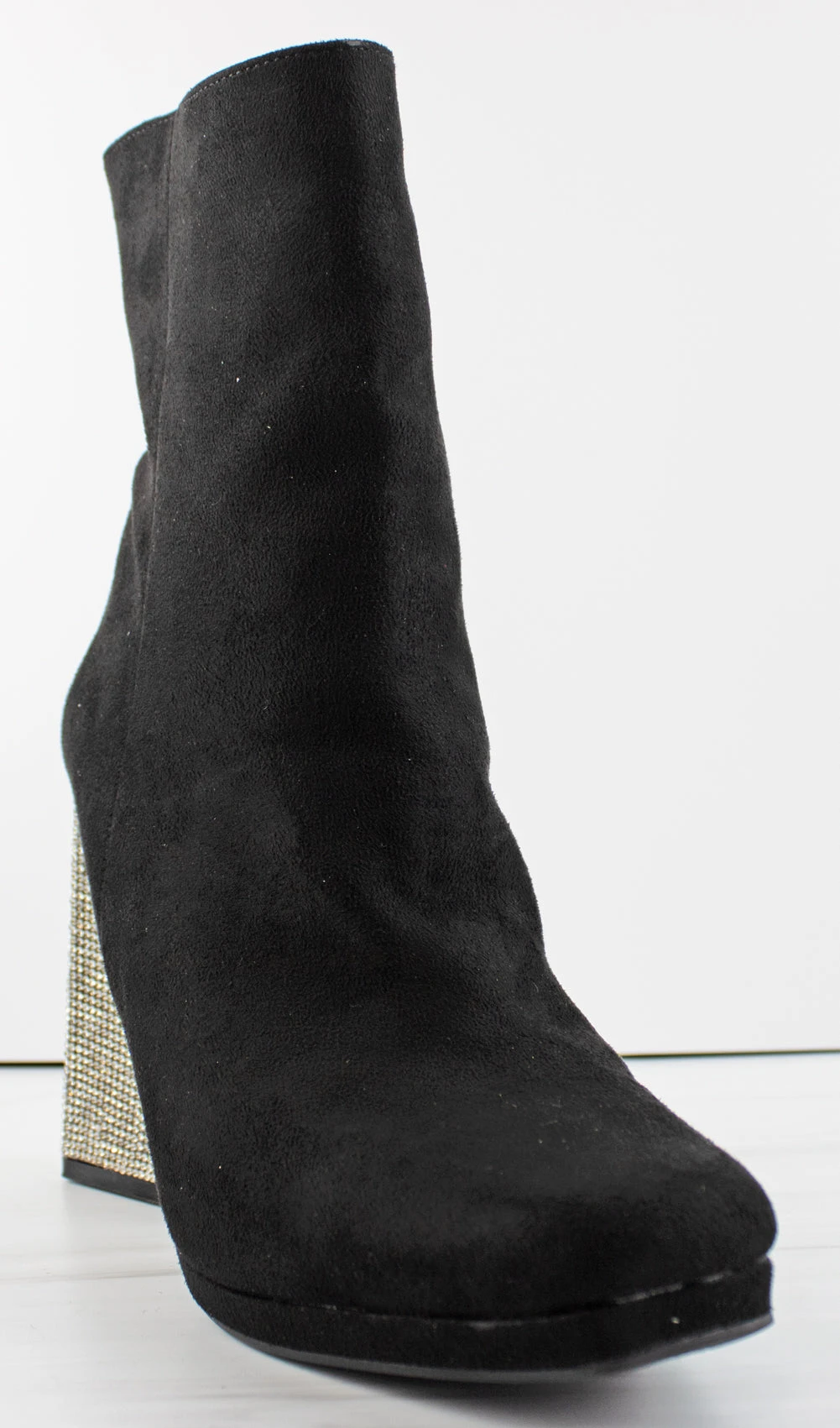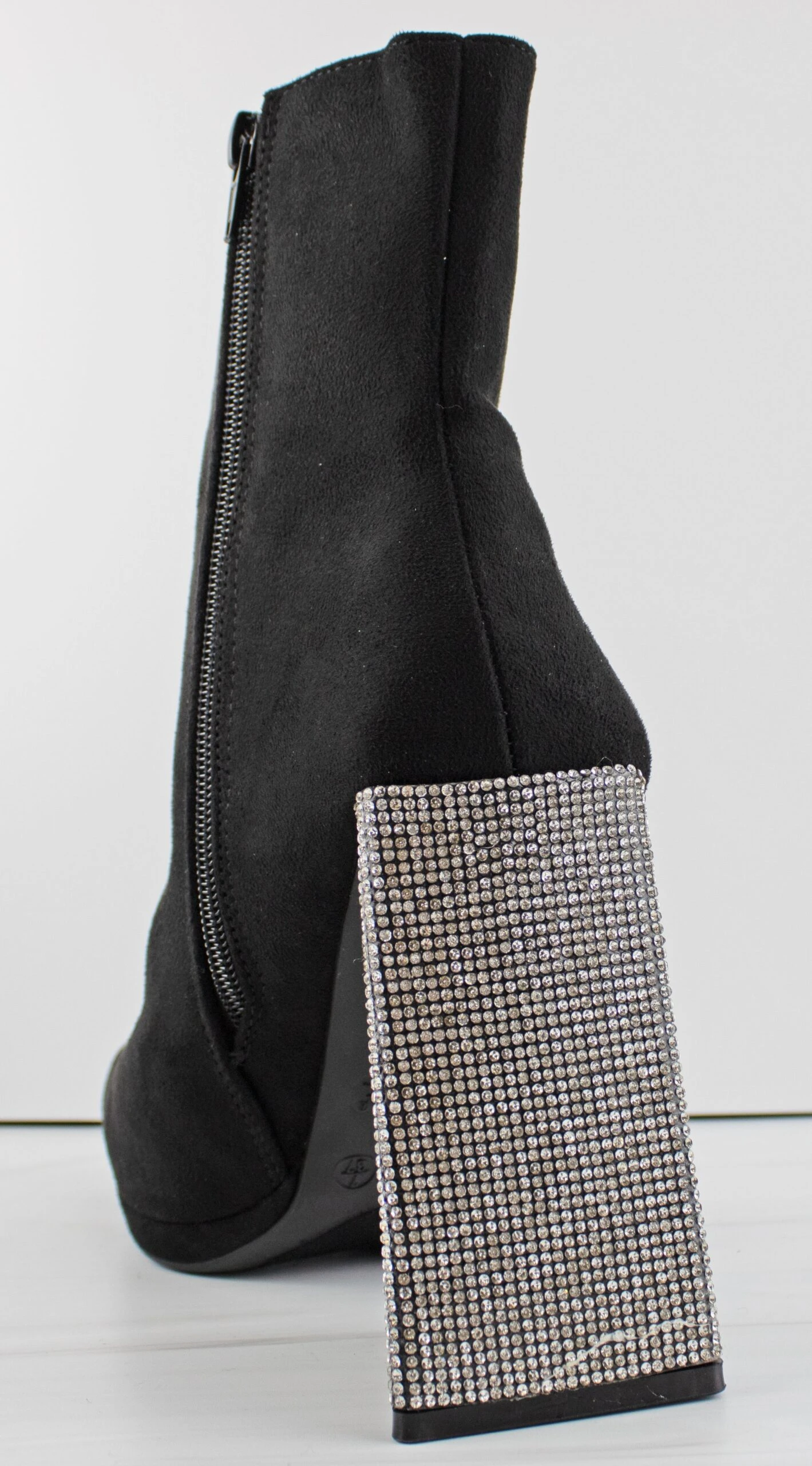 Dare to dazzle in these bold and brilliant booties! A classic square toe silhouette gets a major revamp with allover rhinestone embellished pyramid heel! Heel Height Approx. 3.5 inches.Â