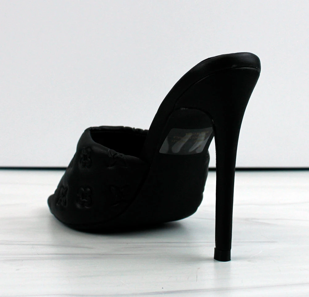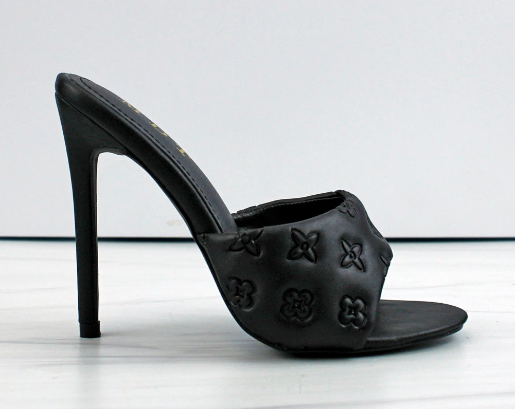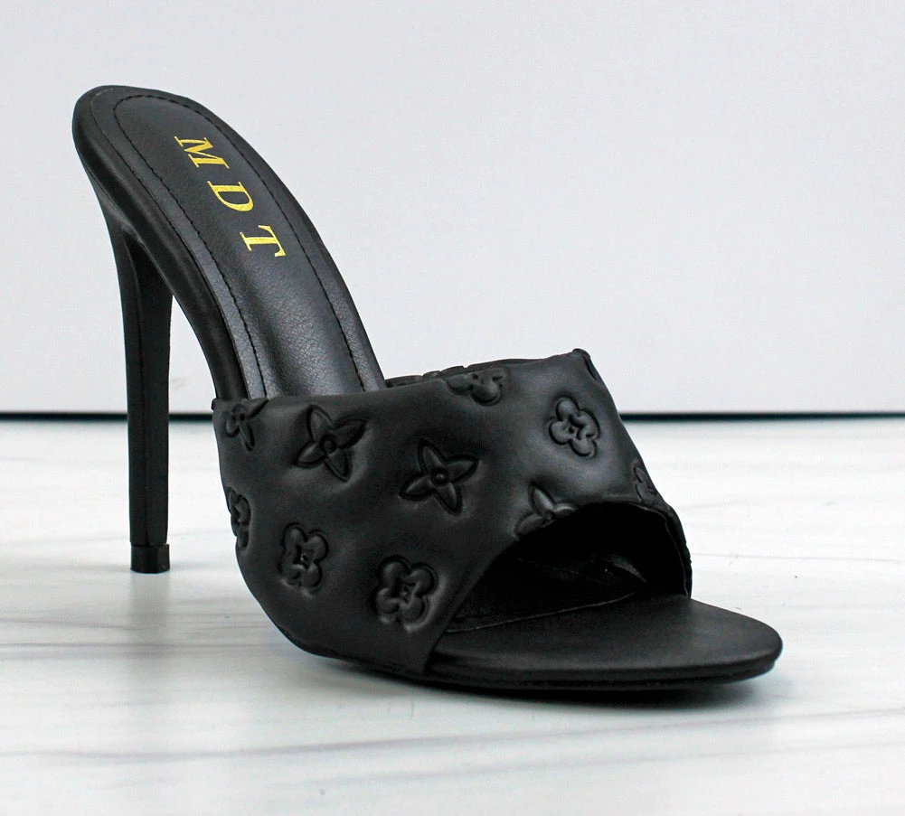 Daring five inch heeled sandal with popular pattern and padded for comfort