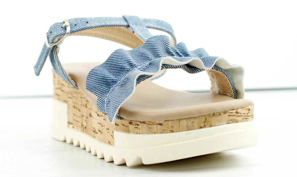 These little girls’ platform sandals are perfect for everyday wear this summer! These sandals feature a buckle clasp sandal back as well as a single ruffle band strap that goes over the foot to secure them.Â