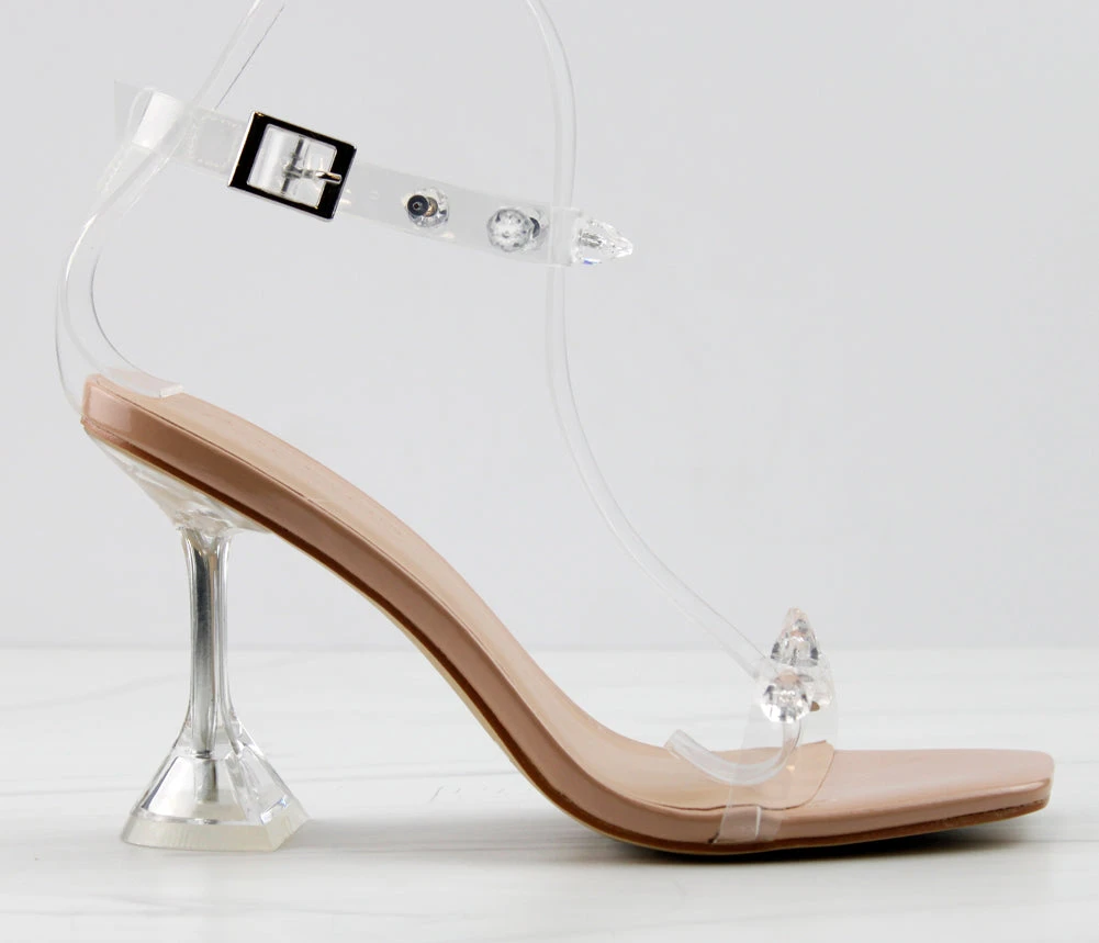 Strap pyramid heels with clear straps and nude bottom. Clear spikes are embellished around the ankle strap and across the toe strap. Any outfit can be paired with these heels.