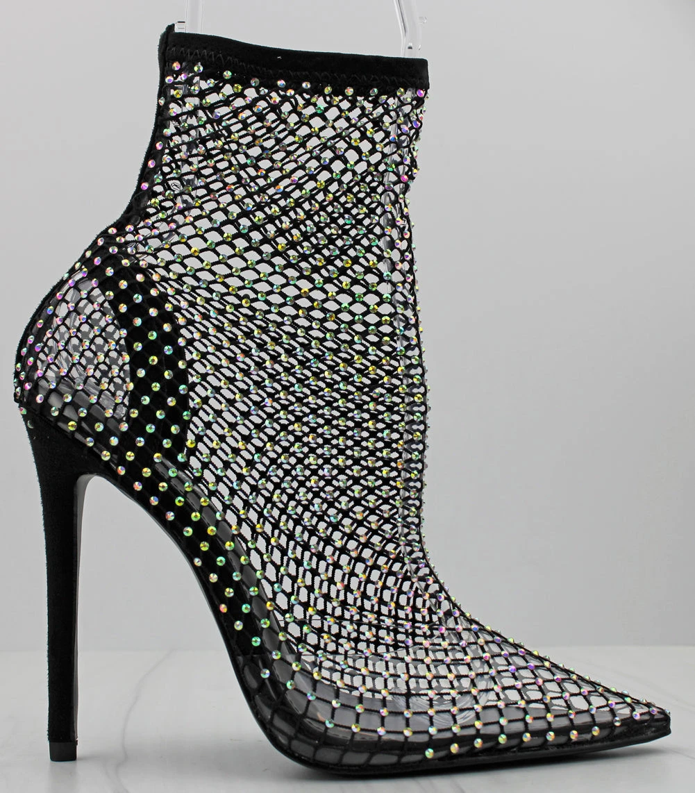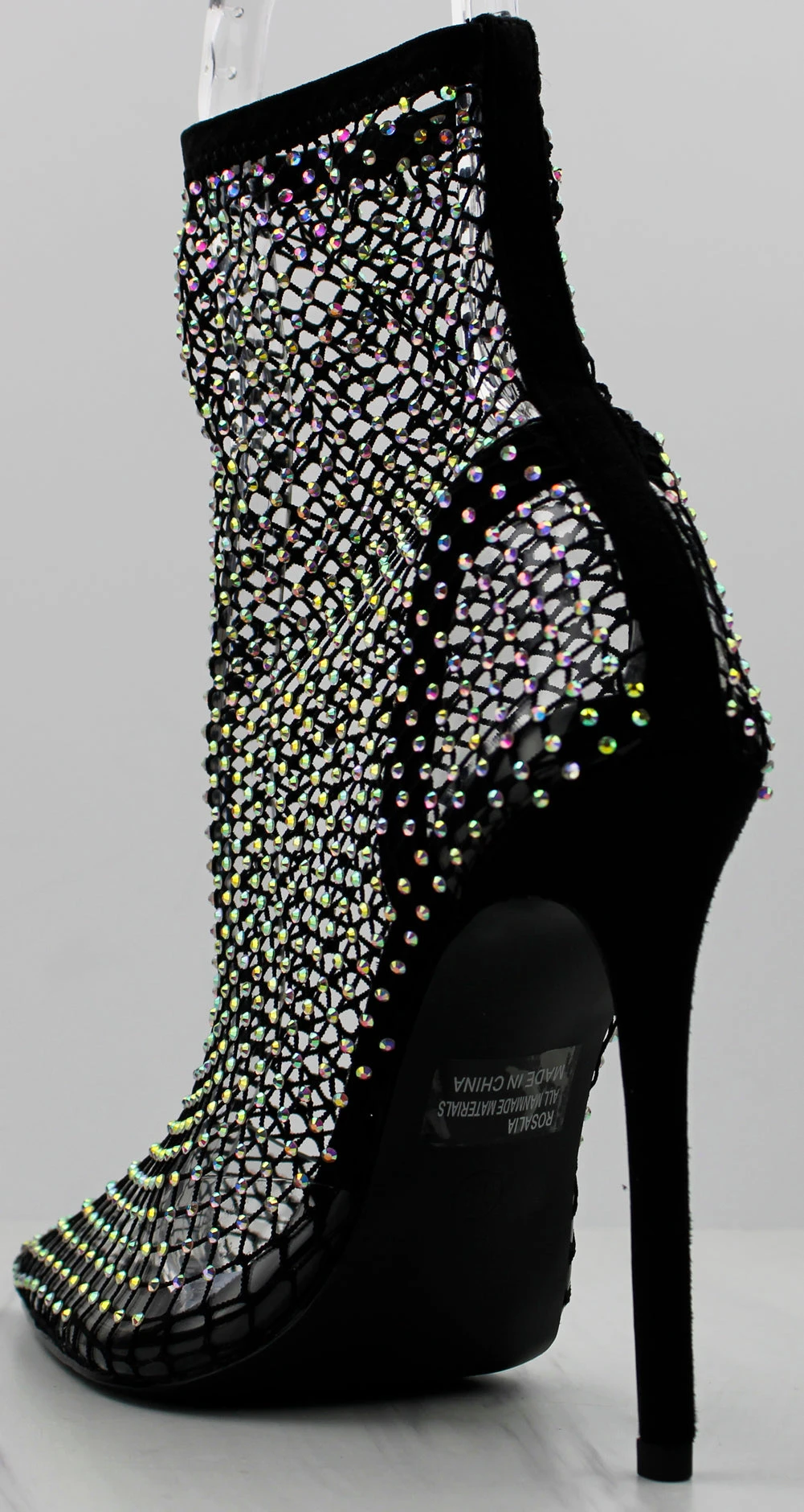 Diamonds are a girl’s best friend! Featuring a stunning rhinestone embellishment all over and a fishnet design these heels make an entrance anywhere they go. Approx 3.5 inch heel.