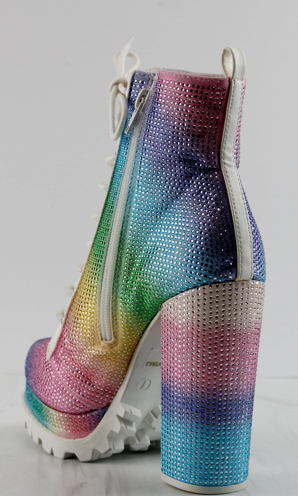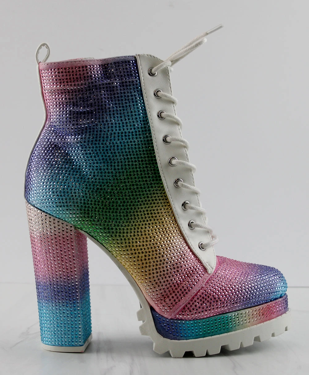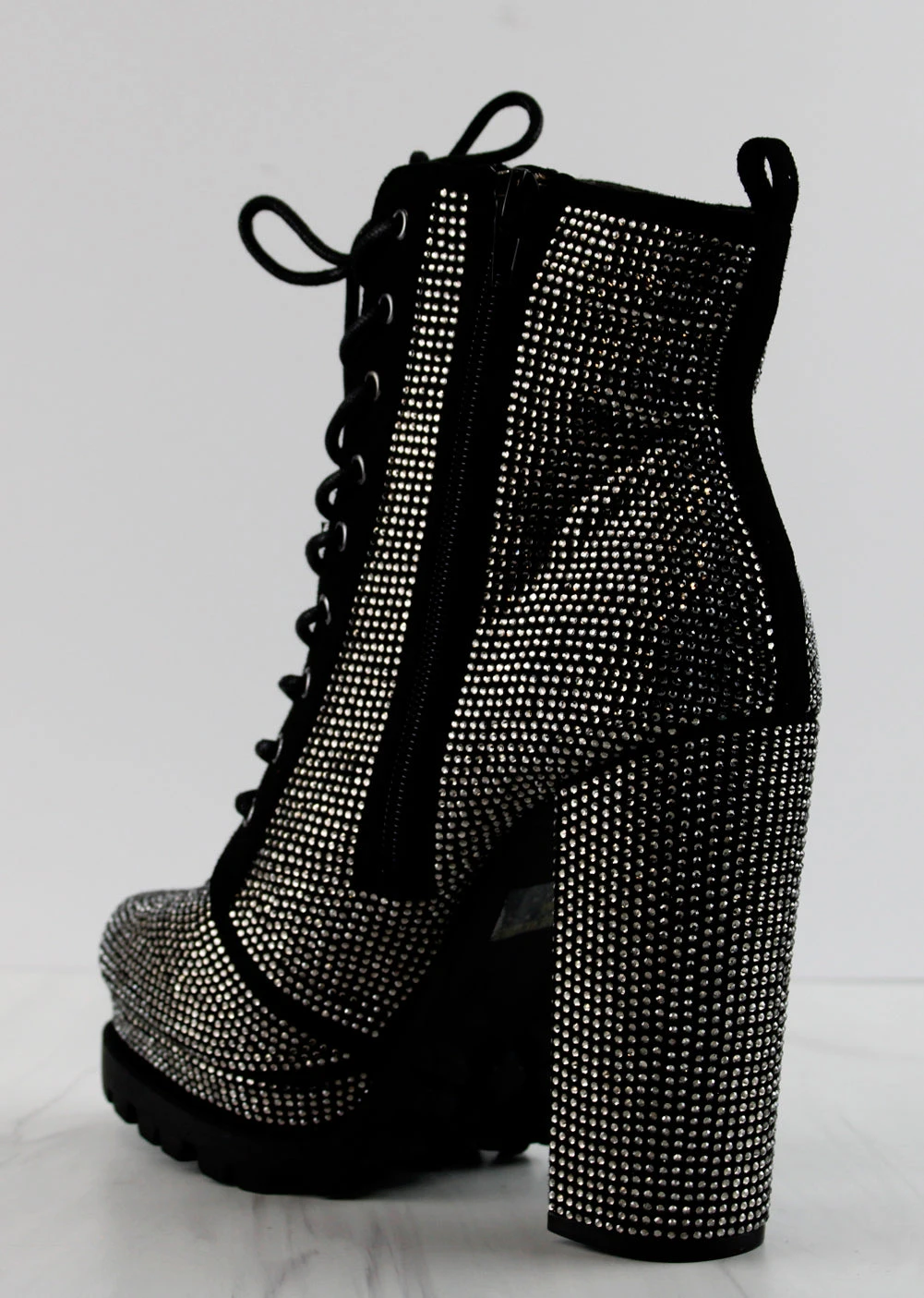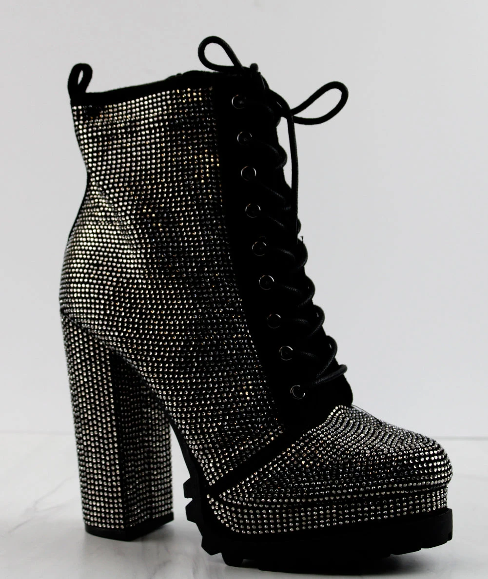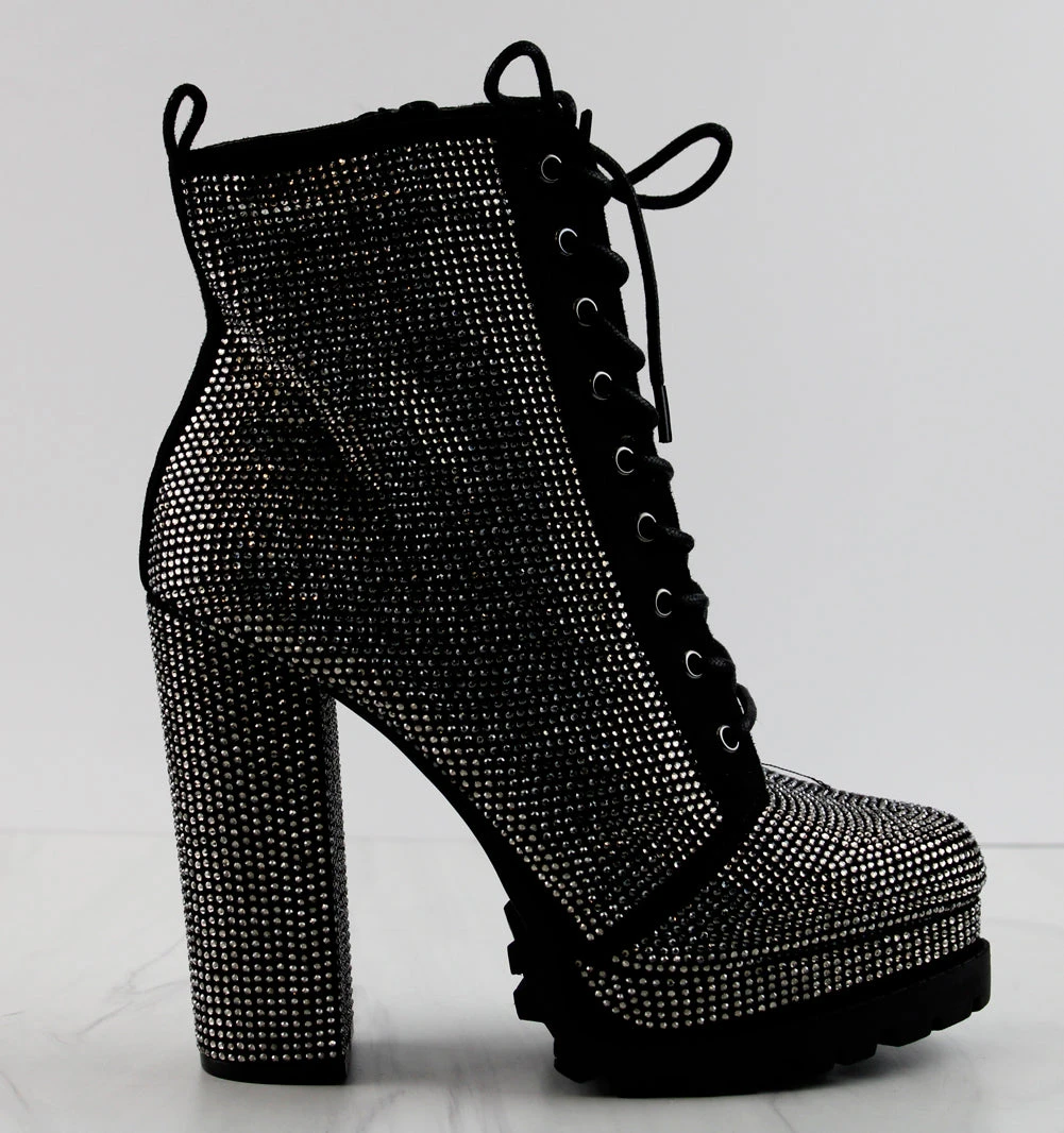Look ravishing from heel toe in this platform bootie. Flaunting all-over stud accents on the suede-like profile, this zipper bootie has an alternative feminine lace-up front and a supportive wrapped block heel and platform.