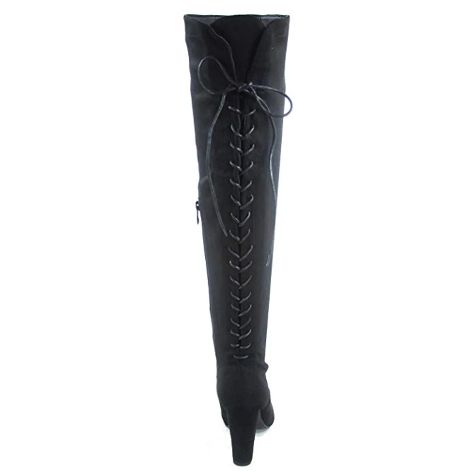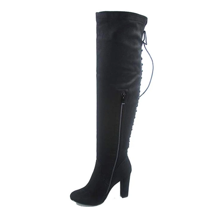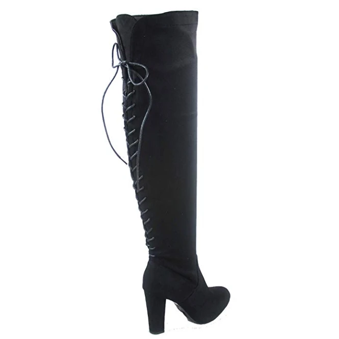Featuring a chunky heel that gives you a boost of height, this beautiful boot with a chic lace up back is going to dress up any of your cooler weather looks!Â